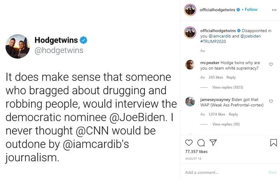 In the video, the twins slammed Cardi B for interviewing the presidential candidate, Joe Biden. They said that politics isn't her thing. She should shut up and rap.